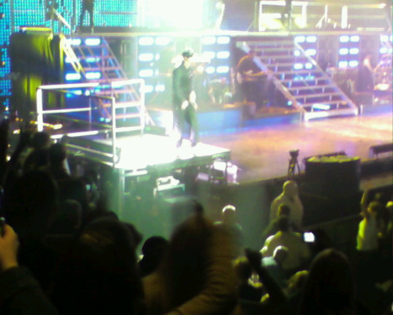 Here’s the scene…lights down, crowd is screaming at the top of its collective lungs, and the “kids” rise out of the top level of the stage, while the opening chords of “Single” loop over and over. The crowd loses it, and instantly, my eardrums determine that their very survival is in jeopardy. This went on non-stop. It was as if the fans were trying to make up for every concert they SHOULD have been at for the past 15 years, all in one pop. I still feel a slight ring in my ears two days later. That’s not a good sign.